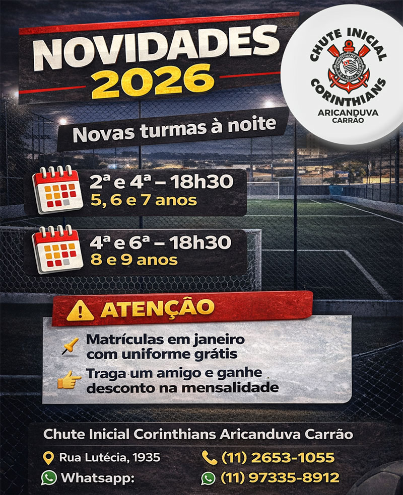 O ano de 2026 começa com grandes novidades para os pequenos craques do Chute Inicial Corinthians Aricanduva | Carrão!